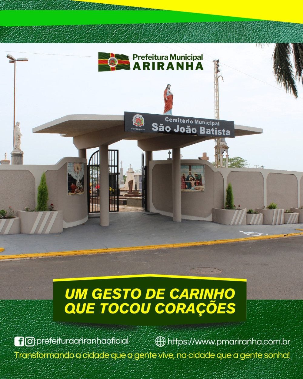 O trabalho de revitalização do Cemitério São João Batista reflete o compromisso da gestão municipal em valorizar a memória e o sentimento das famílias ariranhenses, demonstrando que cuidar da cidade também é respeitar sua história e quem fez parte dela.