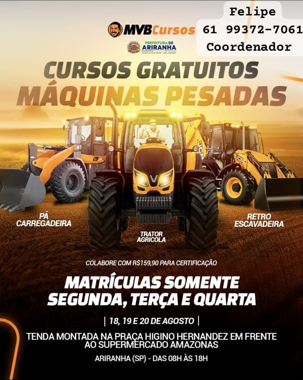 A Prefeitura de Ariranha firmou um Termo de Cooperação com o Instituto Benigno Masiero para oferecer gratuitamente à população cursos de operador de máquinas pesadas: trator agrícola, retroescavadeira e pá carregadeira.