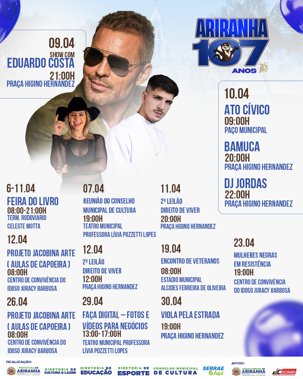 Em comemoração aos 107 anos de Ariranha, a cidade receberá um espetáculo especial com o cantor Eduardo Costa.
