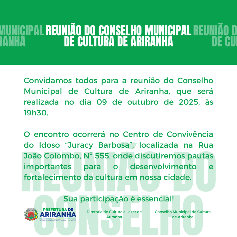 Convidamos toda a comunidade para a Reunião do Conselho Municipal de Cultura de Ariranha, que acontecerá no dia 09 de outubro de 2025, às 19h30, no Centro de Convivência do Idoso “Juracy Barbosa” (Rua João Colombo, Nº 555).