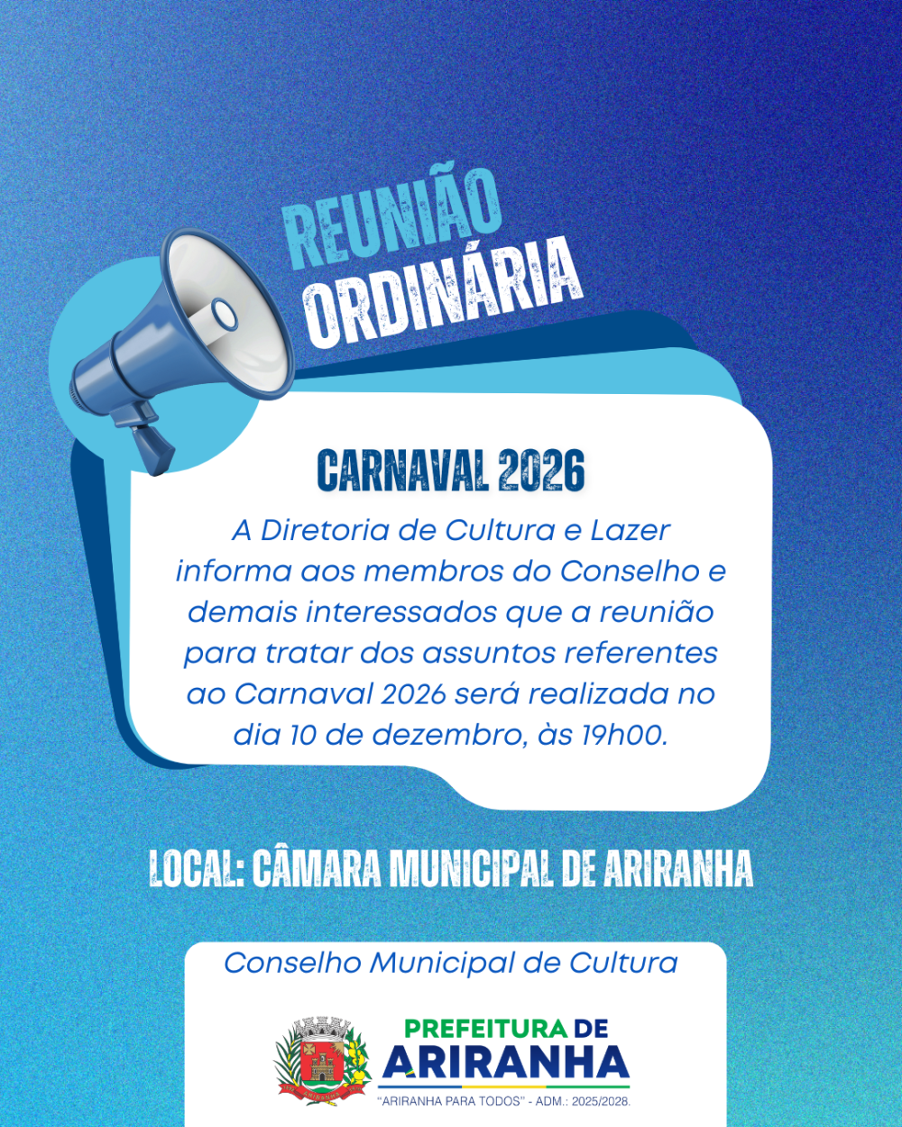 A Diretoria Municipal de Cultura e Lazer informa que será realizada, no dia 10 de dezembro, às 19h00, na Câmara Municipal de Ariranha, a reunião ordinária do Conselho Municipal de Cultura, com pauta exclusiva dedicada ao Carnaval 2026.
