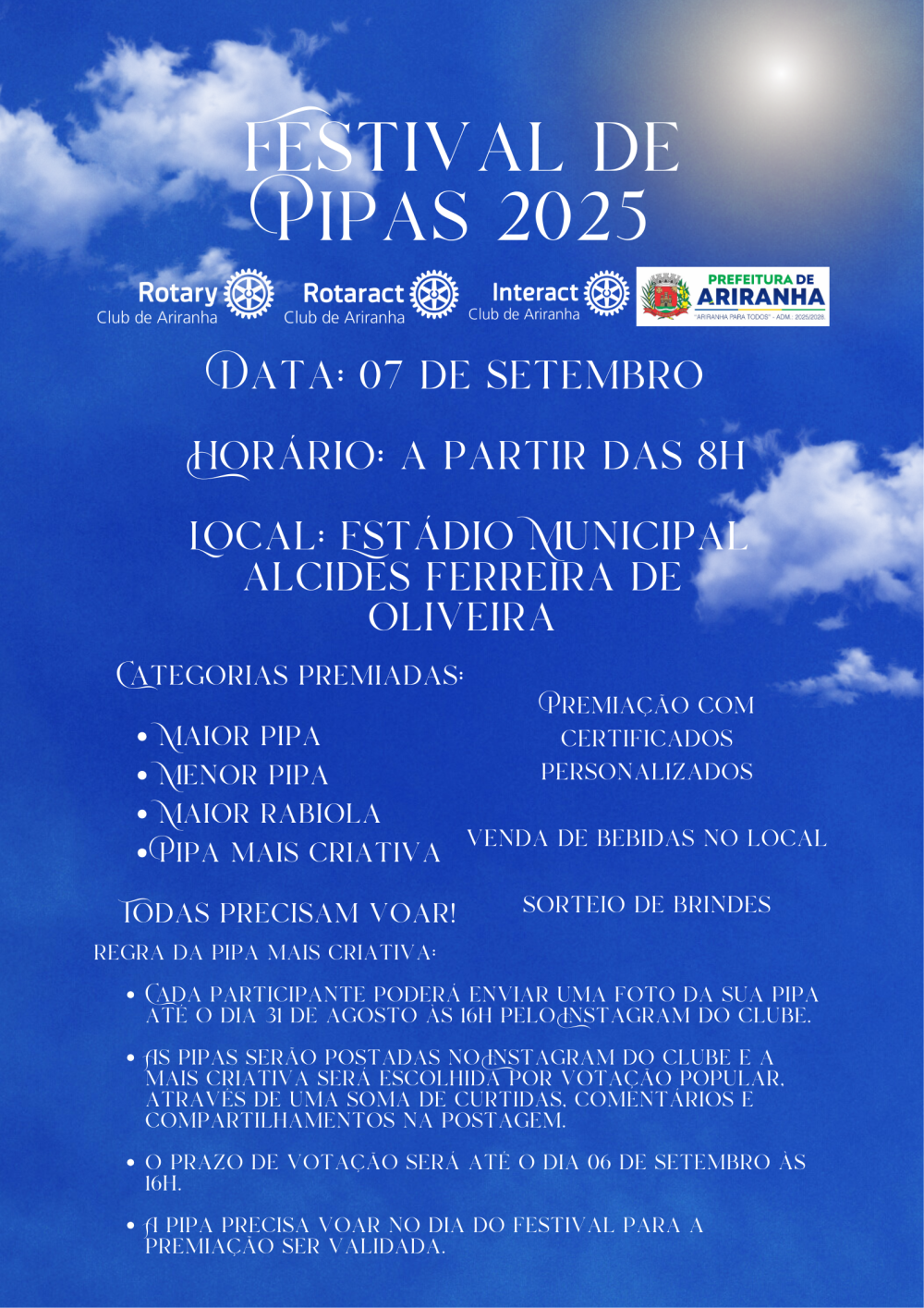 Organizado pelo Rotaract e Interact Club de Ariranha, com apoio do Rotary Club de Ariranha e da Prefeitura Municipal, o festival contará com diversas categorias premiadas: maior pipa, menor pipa, maior rabiola e pipa mais criativa. Todas as pipas participantes precisarão voar no dia do evento para que a premiação seja validada.