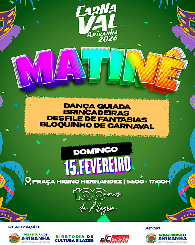 A Matinê do Carnaval Ariranha 2026 chega com uma programação pensada especialmente para os pequenos: