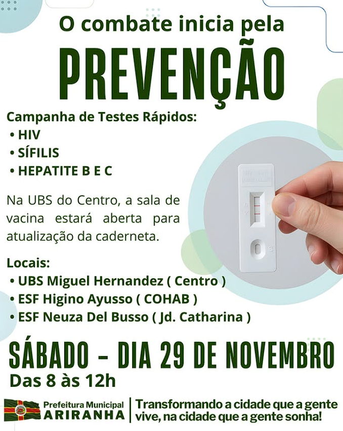 O combate às Infecções Sexualmente Transmissíveis começa pela prevenção. Neste sábado, a rede municipal de saúde realiza uma ação especial com testes rápidos de HIV, Sífilis e Hepatites B e C.