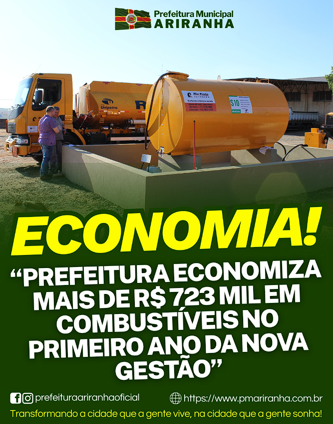 A Prefeitura de Ariranha registrou uma economia de R$ 723.182,19 nos gastos com combustíveis durante o primeiro ano da atual gestão, conforme balanço financeiro divulgado nesta semana.