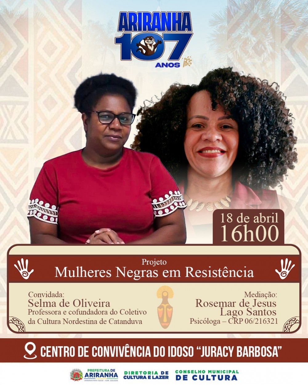 Em comemoração aos 107 anos de Ariranha, convidamos toda a comunidade para um encontro de diálogo, força e representatividade: o projeto Mulheres Negras em Resistência.